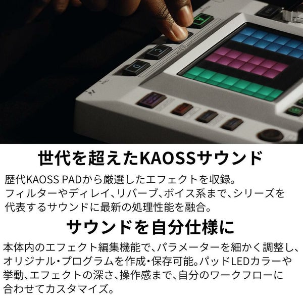 フィルター、ディレイ、リバーブ、モジュレーション、ボイス処理など、KAOSSシリーズを象徴するサウンドと、現代的な処理能力が融合しています。