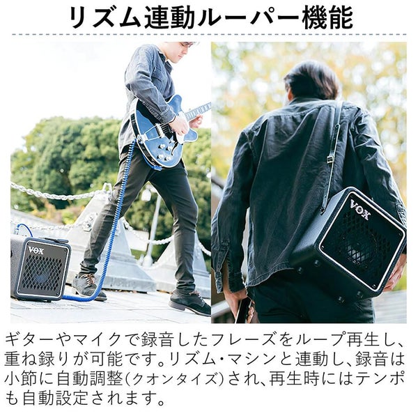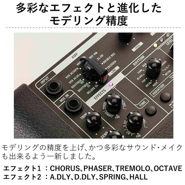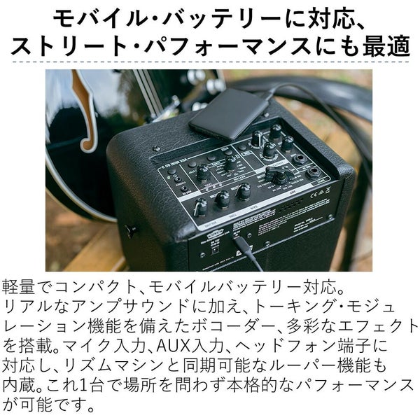 軽量・コンパクト、モバイル・バッテリー対応、リアルなアンプ・サウンド、トーキング・モジュレーションを複合するボコーダー、多彩なエフェクト、マイク入力、AUX入力、ヘッドフォン端子、さらに多様なジャンルのリズム・パターンを再生可能なリズム・マシンと、そのリズムに同期可能なルーパー機能を搭載。この1台でいつでもどこでも場所を選ばずに最高のパフォーマンスをすることができます。