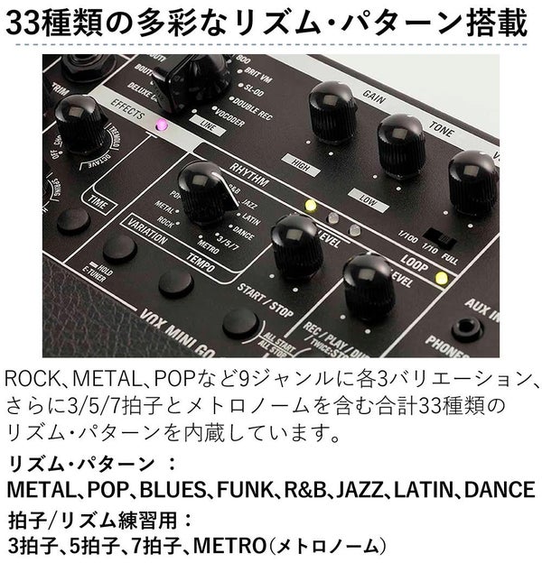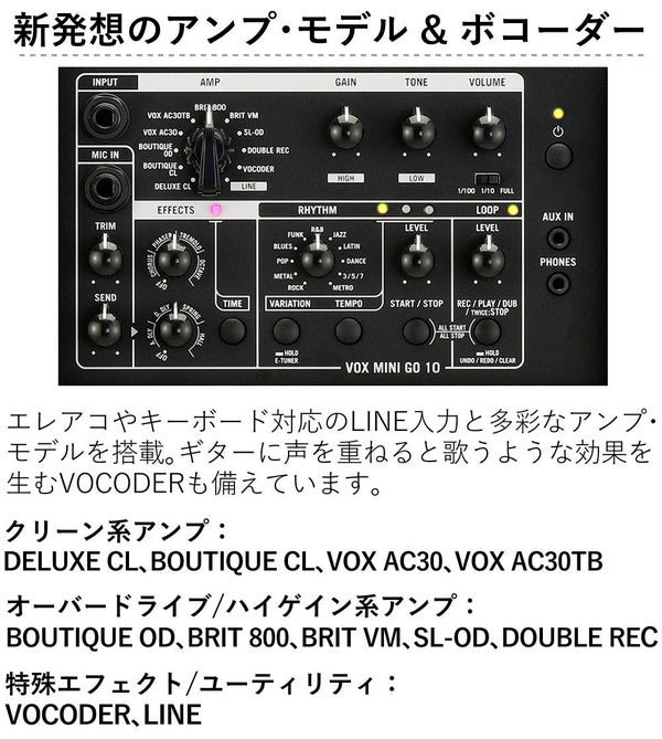 VOX の MINI?GO?10 は、出力10W のモデリング・ギターアンプで、軽量・コンパクト設計により自宅からストリート演奏まで幅広く対応します。11 種類のアンプ・モデルと 8 種類のエフェクトを内蔵し、33 パターンのリズム・マシンとルーパー機能でソロ演奏も自在です。VOCODER によるトーキング・モジュレーション効果も搭載し、マイク入力や AUX 入力、ヘッドフォン端子を備え、弾き語り用途にも最適。VOX Cambridge50 系サウンドを継承した VET モデリング技術で、FULL/1/10/1/100 出力切替によりボリューム調整も自由。DC 12V/5V(モバイル・バッテリー給電)対応で、持ち運び性能も高く、あらゆる場面で活躍するギターアンプです。