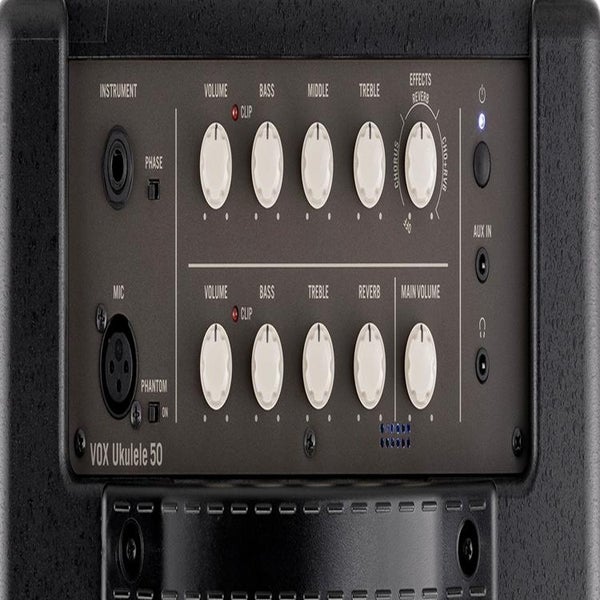 ウクレレ・プレーヤーのニーズに合わせ、ウクレレの音域にフォーカスしてヴォイシングした、小型軽量の50W出力を誇る専用アンプです。ピックアップを搭載したウクレレでは、PA卓またはアコギ用などのギター・アンプに接続するしかないというのが現状です。このVOX Ukulele 50は、ウクレレのサウンドを効果的に鳴らせるアンプを探しているプレーヤーへの大事なソリューションとなります。次世代真空管Nutubeを搭載することにより、サウンドに豊かな深さを引き出し、理想的なウクレレのサウンドを出力することができます。