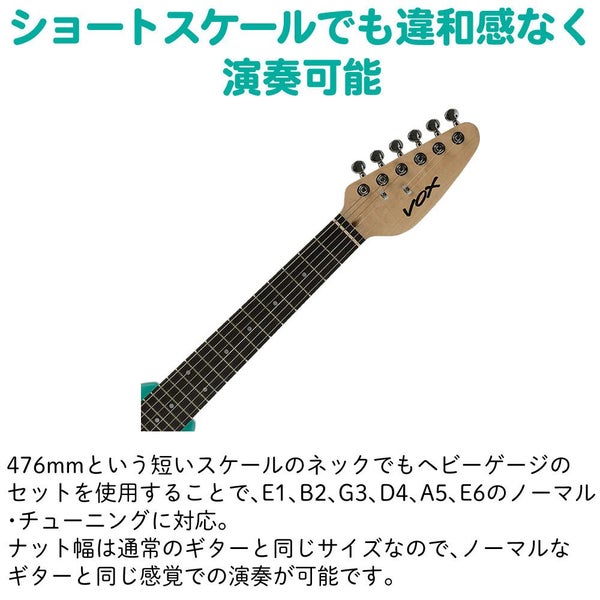 476mmという短いスケールのネックでもヘビーチューズのセットを使用することで、E1、B2、G3、D4、A5、E6のノーマル・チューニングに対応。セット幅は通常のギターと同じサイズなので、ノーマルなギターと同じ感覚での演奏が可能です。