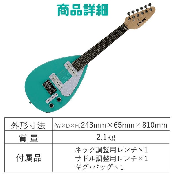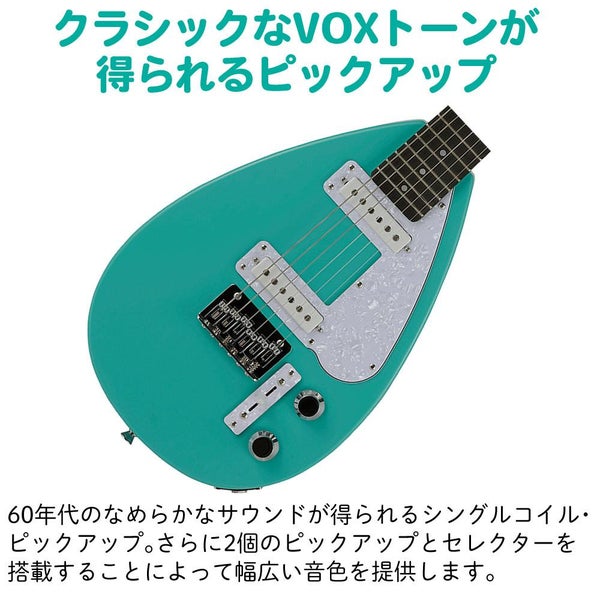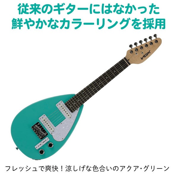 レトロでポップなデザインが魅力の VOX MARK3 mini は、 ショートスケール 仕様の ミニギター 。 アクアグリーン のカラーが印象的で、 軽量 ・ コンパクト なため 子供用 や 女性向け にも最適。 練習用 や サブギター にもおすすめ。