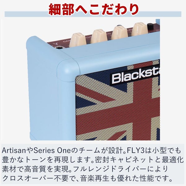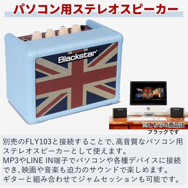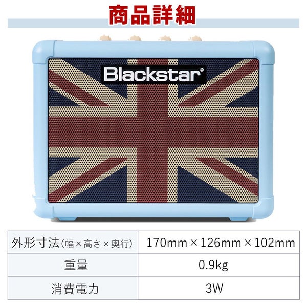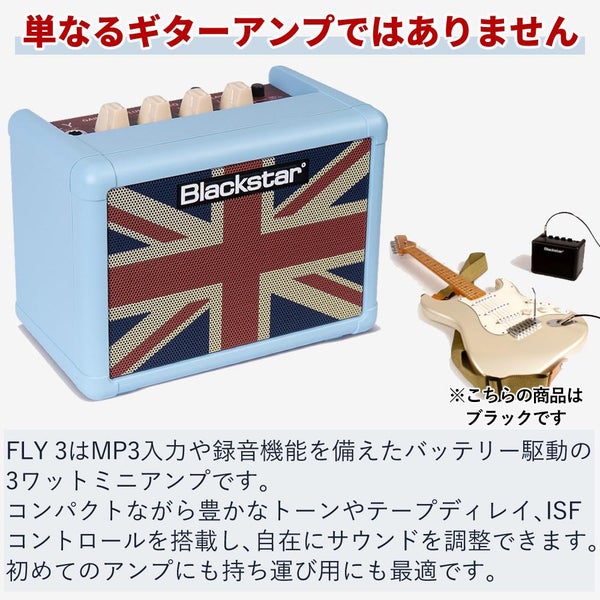 ブラックスター の FLY3 BabyBlue は ユニオンフラッグ デザイン が魅力の コンパクト ギターアンプ です。ポータブル で 電池駆動 に対応し 自宅 や 練習用 に最適。おしゃれ ベビーブルー カラー と AUX入力 スピーカー内蔵 で 多彩 な 音質調整 を楽しめます。