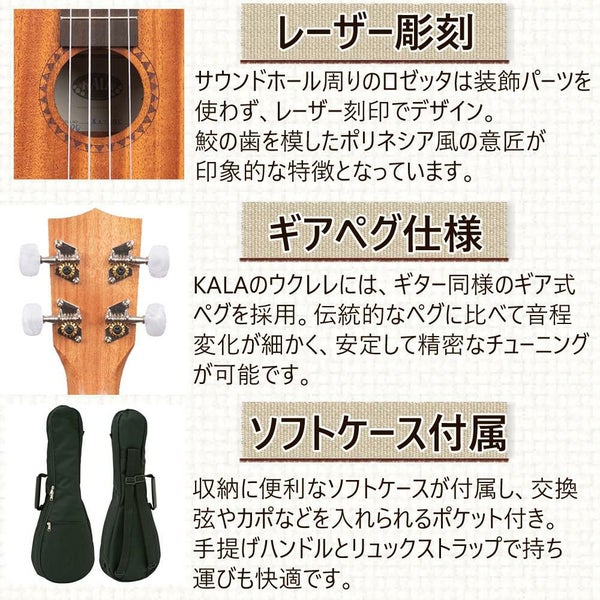 KA?15 Series は、 KALA の フラッグシップ マホガニー コレクションとして 業界 定番 の ウクレレ モデル です。 ソプラノ コンサート テナー に加え ロングネック 仕様 も展開し、ポリネシアン ロゼッタ(鮫の歯 モチーフ)の レーザー刻印 や サテン仕上げ が おしゃれ。 ギアペグ 搭載 で チューニング 安定、 初心者 は もちろん 中級者 にも リーズナブル で 高品質。 2005年 ペタルマ(アメリカ) 創立 の KALA ブランド による、 持ち運び にも 便利 な ソフトケース 付属。 世代を超えて愛される 定番 ウクレレ です。