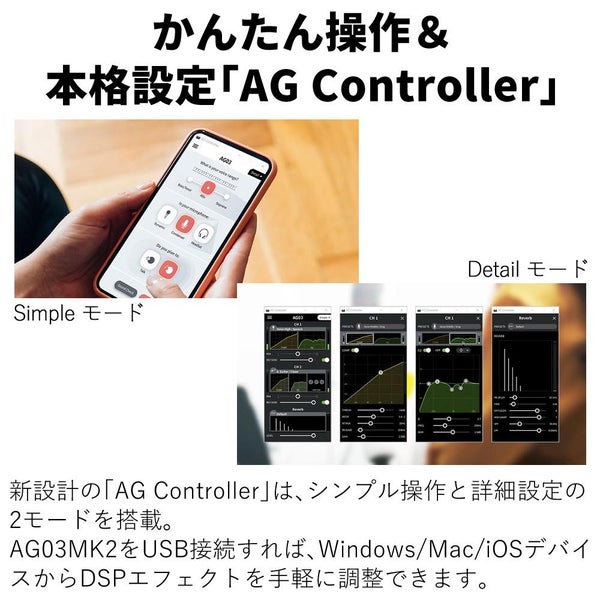 AG03MK2は、「AG Controller」アプリと連携して、PCやiOSデバイス上で詳細設定が可能です。
