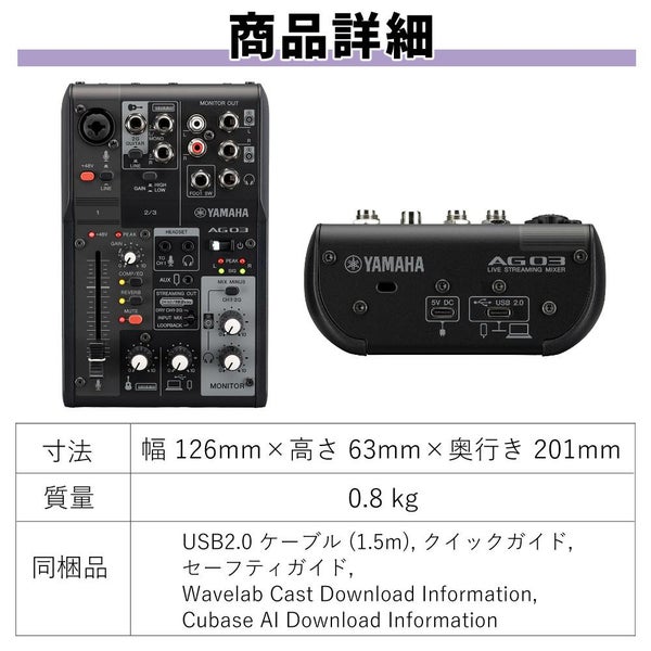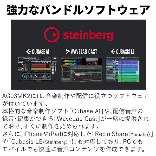 Yamaha AG03MK2 は ライブストリーミング ミキサー として Android 対応 や iOS 対応 の スマートフォン配信 に最適な 3チャンネル USBオーディオインターフェース です。ミュートボタン や ループバック 機能、4極ミニ TRRS 入出力 により 多彩な 配信スタイル を実現し、コンボ入力 や Hi?Z ギター入力、+48Vファンタム電源 により マイク や 楽器 をバランスよく扱えます。DSPエフェクト(コンプレッサー EQ リバーブ AMPシミュレータ)と AG Controller により音質調整も自在。Cubase?AI や WaveLab?Cast、Rec’n’Share のバンドル音楽/配信ソフトと、24bit 192kHz の 高音質 録音 が可能な コンパクト かつ堅牢な ブラックモデル B 型のメタルシャーシ で、モバイル電源対応 の 配信スタジオ を手軽に構築できます。