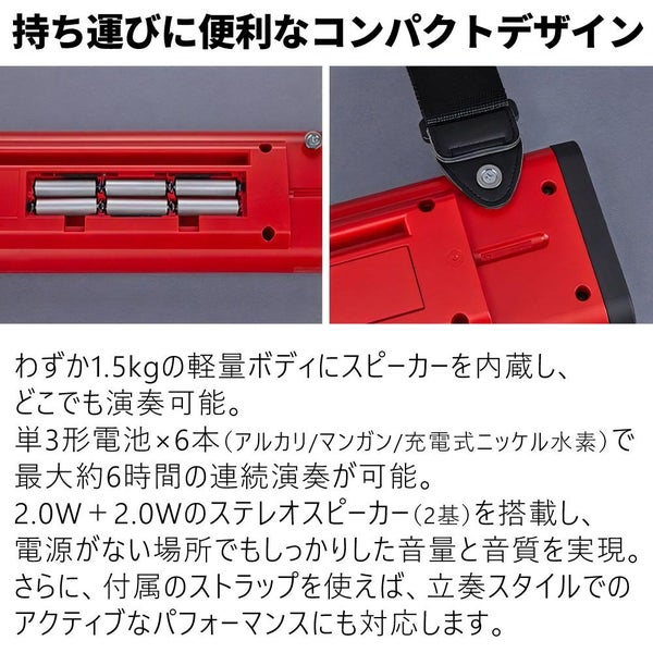 スピーカーを内蔵し、電池駆動に対応しているため、どこでも手軽に演奏を楽しめます。