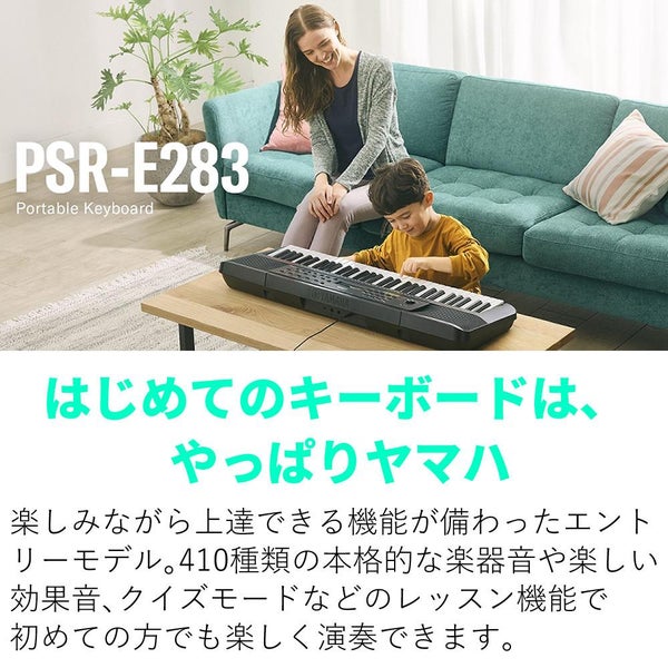 ヤマハ PSR?E283 キーボード は 初心者 に最適 な 61鍵盤 エントリーモデル で、410音色 や 122内蔵曲、効果音 や クイズモード など 楽しく 上達 できる レッスン機能 が充実。スマートコード 自動伴奏 や 150スタイル で 伴奏 演奏 も簡単 です。録音 再生、電池駆動、譜面台 付属 で 家庭用 にも 便利 な 鍵盤楽器 です。