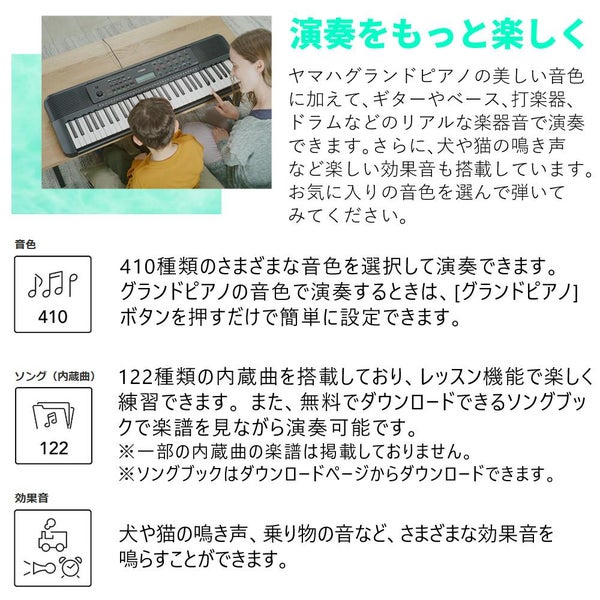122種類の内蔵曲を搭載しており、レッスン機能で楽しく練習できます。また、無料でダウンロードできるソングブックで楽譜を見ながら演奏可能です。