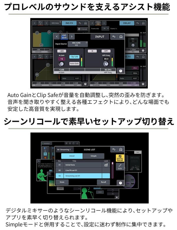 | シグナルプロセッサー(DSP) | ゲート,コンプレッサー,EQ,Sweet Spot Morphingチャンネルストリップ(コンプ&EQ),Guitar Amp Classics(アンプシミュレーター),Pitch Fix(ボイスチェンジャー),ダッカー,Ducker,Multi-Band Compressor,Compander,Delay,REV-X(リバーブ) |
