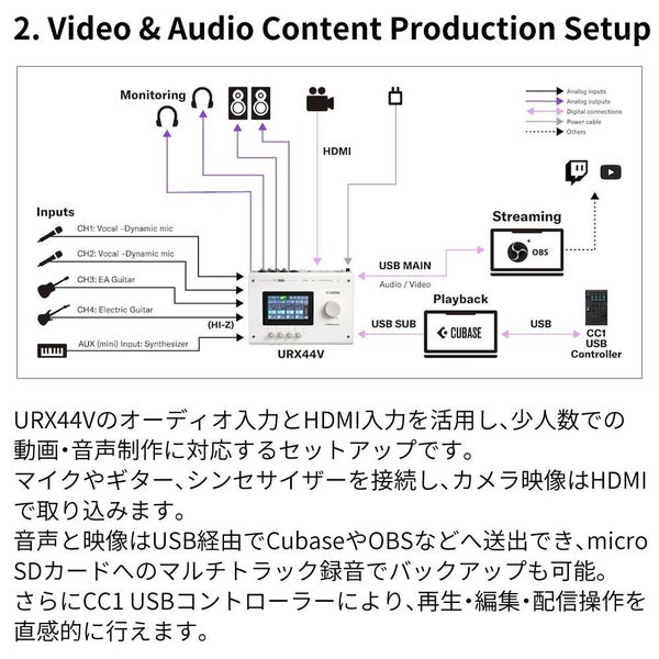 | 同梱品 | スタートガイド,セーフティガイド,Steinbergソフトウェアライセンスカード×1(Cubase AI,Wavelab Cast,Basic FX Suite,Steinberg Plus),USB-C to USB-Cケーブル(USB3.2,1m),AC電源アダプター(PA-300,電源コード付属) |