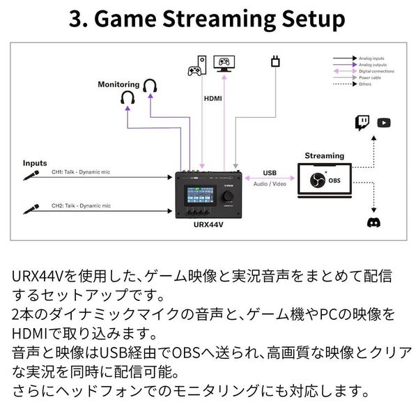 | アナログ入力 | 4 Combo(2 Mic/Line/3.5mmヘッドセットマイク,2 Mic/Line/Hi-Z)+1 AUX(3.5mm phone) |
