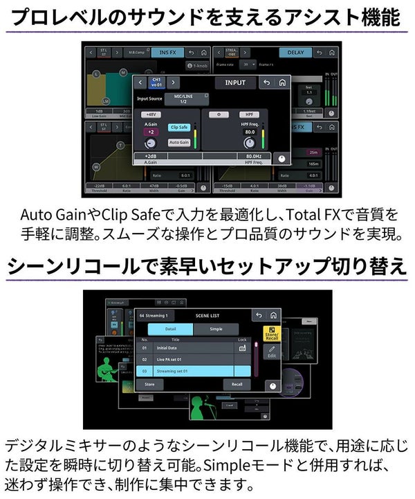 | シグナルプロセッサー(DSP) | ゲート,コンプレッサー,EQ,Sweet Spot Morphingチャンネルストリップ(コンプ&EQ),Guitar Amp Classics(アンプシミュレーター),Pitch Fix(ボイスチェンジャー),ダッカー,Ducker,Multi-Band Compressor,Compander,Delay,REV-X(リバーブ) |