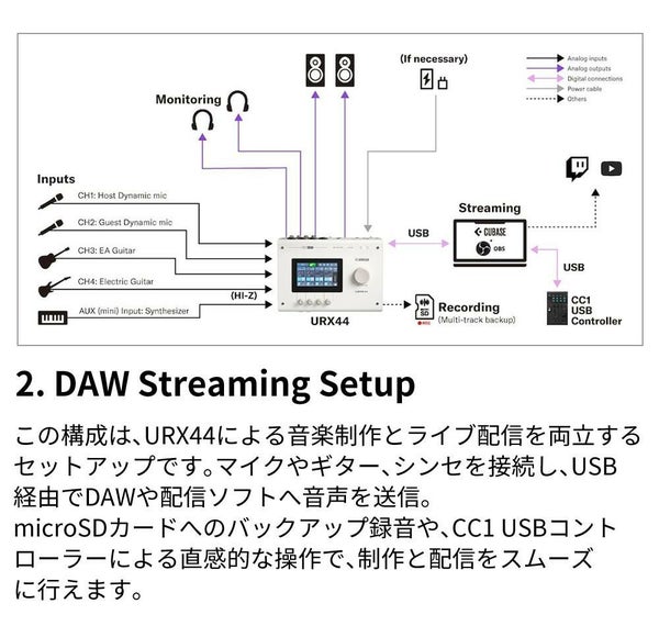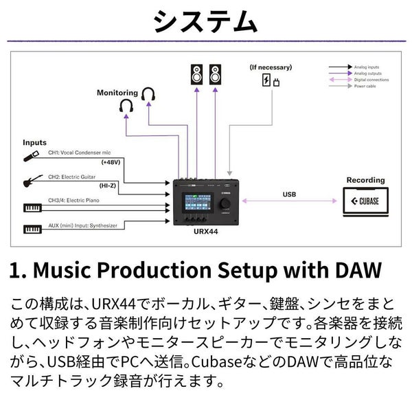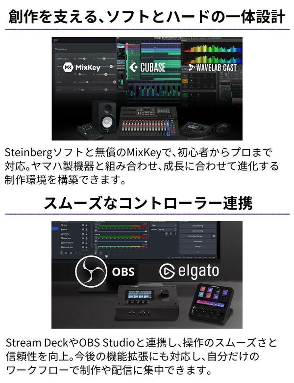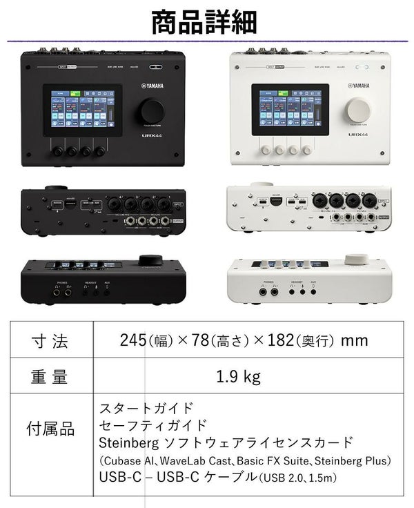 | 同梱品 | スタートガイド,セーフティガイド,Steinbergソフトウェアライセンスカード×1(Cubase AI,Wavelab Cast,Basic FX Suite,Steinberg Plus),USB-C to USB-Cケーブル(USB2.0,1.5m) |