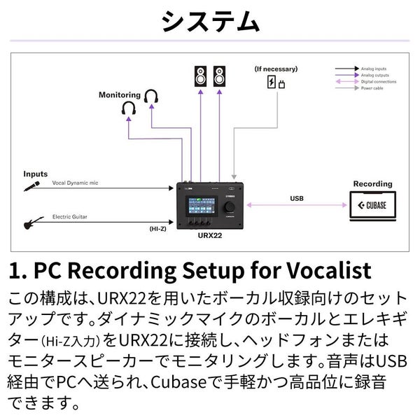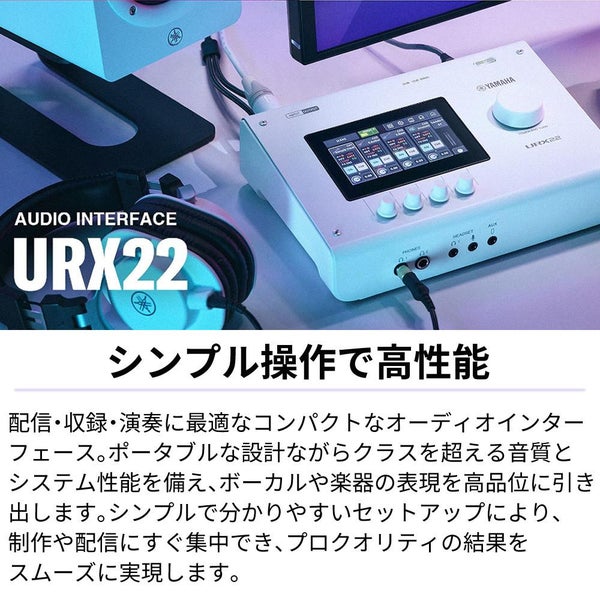 ヤマハ オーディオインターフェース URX22 は USB?C 接続対応で 32bit 192kHz 高性能 コンパクト モデルとして配信 収録 ライブ 制作 に最適です。125dB ダイナミックレンジ と 78dB ゲインを誇る URX マイクプリアンプ により 原音 忠実な サウンド を実現し、Mic/Line AUX 入力 や ライン出力 ヘッドホン出力 も充実。内蔵 DSP ミキシング や タッチ LCD 画面 で 直感操作 が可能で AutoGain ClipSafe SceneRecall など 便利な 機能 を装備。付属 の Steinberg ソフト(Cubase AI Wavelab Cast Basic FX Suite Steinberg Plus)と組み合わせれば 初心者 から プロ まで 幅広く 快適な 音楽制作 環境 を構築できます。