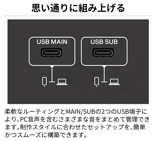 柔軟なルーティングとMAIN/SUBの2つのUSB端子により、PC音声を含むさまざまな音をまとめて管理できます。