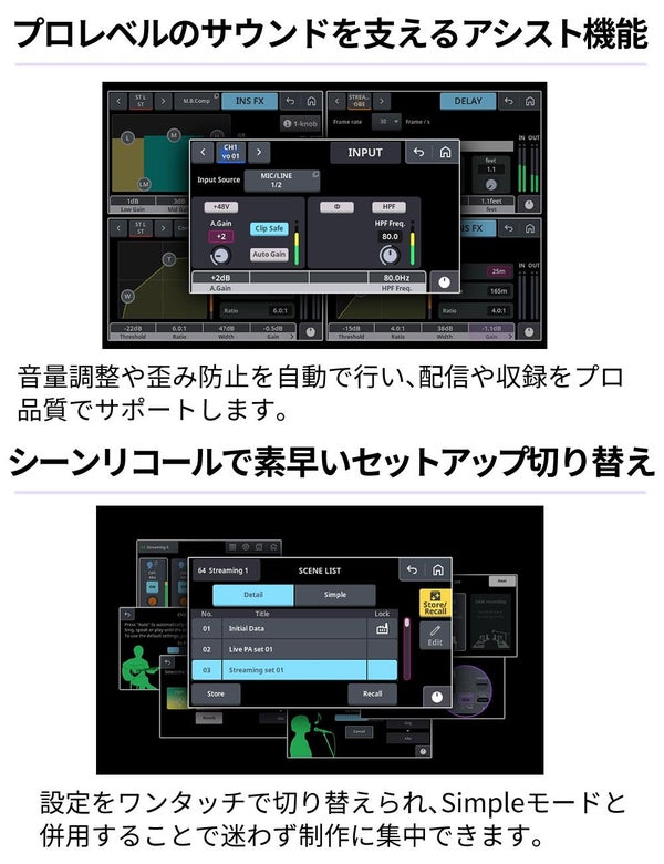 Auto Gain、Clip Safe、Scene Recallなどのアシスト機能搭載