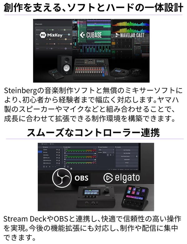 ヤマハ製のスピーカーやマイクなどと組み合わせることで、成長に合わせて拡張できる制作環境を構築できます。
