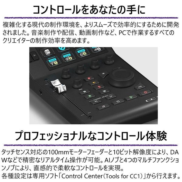 タクタイルコントロールやモーターフェーダーに加え、幅広いソフトウェアと連動するエコシステムにおけるシームレスな互換性を備えたCC1は、ワークフローを最適化したいあらゆるユーザーにとって適した選択肢です。