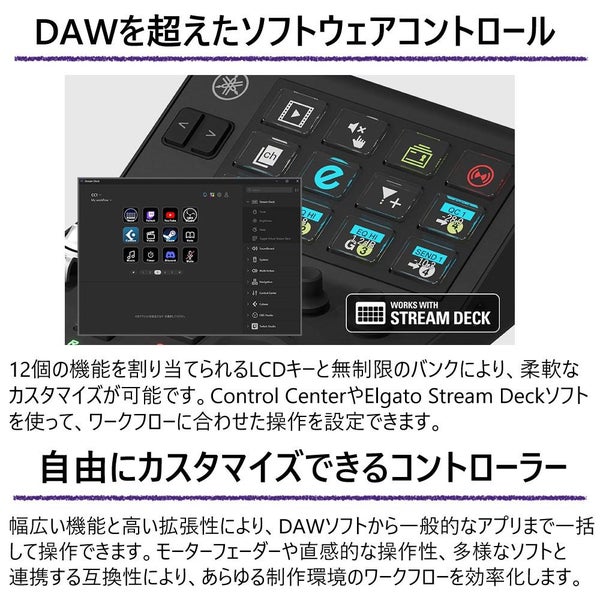 ElgatoのStream Deckソフトウェアに対応した12個のアイコン用有機ELボタンを通して、ユーザーは自由に機能を割り当て、自分のワークフローに合わせてコントローラーをカスタマイズできます。音楽制作だけでなく配信やコンテンツ制作の操作にも柔軟に対応します。