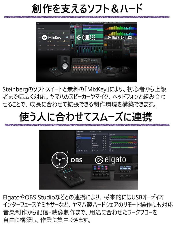 Steinbergのソフトスイートの付属、さらに無料のソフトウェアミキサーMixKeyの組み合わせは、ゼロから始める方はもちろん、新しい制作スタイルやコンテンツ制作へと活動の幅を広げたい経験豊富なクリエイターもサポートします。さらに、ヤマハのスピーカー、マイクロフォン、ヘッドホンなどのラインナップを組み合わせることで、あなたのスキルや制作フローの進化に合わせて拡張していけるシステムを構築できます。