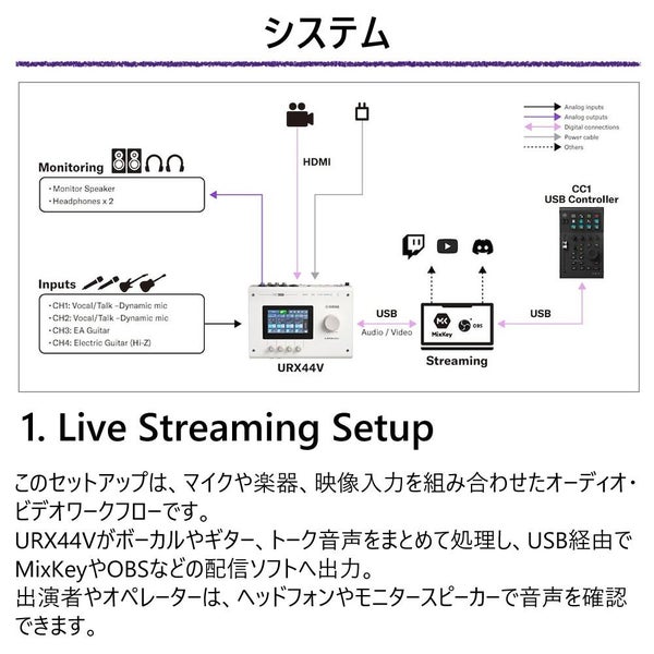 URX44Vがボーカル、トーク用マイク、ギターなどの音声をまとめて処理し、USB経由でMixKeyやOBSなどの配信ソフトへ送ります。