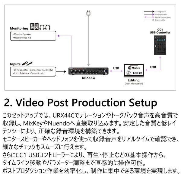 このセットアップでは、URX44Cを用いてナレーション音声やトークバック音声を高品位に収録し、そのままMixKeyやNuendoといった編集ソフトに取り込みます。