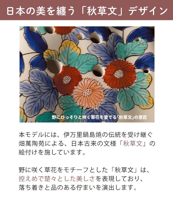 白磁ならではのやわらかな質感と、軽やかな吹奏感を特長とする「AC Triplet A series II」をベースに、伊万里鍋島焼の伝統を受け継ぐ畑萬陶苑による日本古来の文様「秋草文」の絵付けを施した特別仕様です。