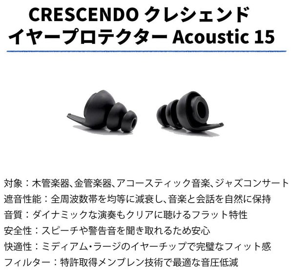 CRESCENDO Acoustic15 イヤープロテクターは、ミュージシャン や ジャズ コンサート/アコースティック 音楽 を楽しむ観客、管楽器/金管楽器 演奏者に最適な 耳栓 です。特許取得 メンブレン フィルター により、約 15 dB の フラット 減衰 で全周波数 をバランス良く抑え、原音保持 と クリア サウンド を実現。会話がしやすく、通気性に優れており 長時間装着 でも耳に優しい設計。Medium/Large の イヤーチップ が付属し、快適なフィット感を保証。付属 の ケース により持ち運びも便利で、聴力保護 を重視するライブ/演奏現場 にも信頼できるアイテムです。