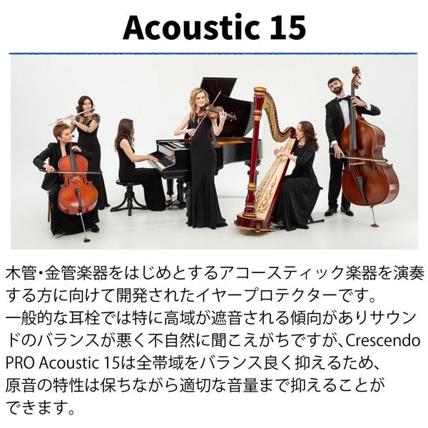 Crescendo PRO Acoustic 15は木管・金管楽器をはじめとするアコースティック楽器を演奏する方に向けて開発されたイヤープロテクターです。