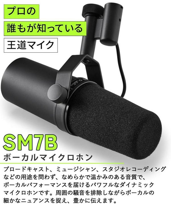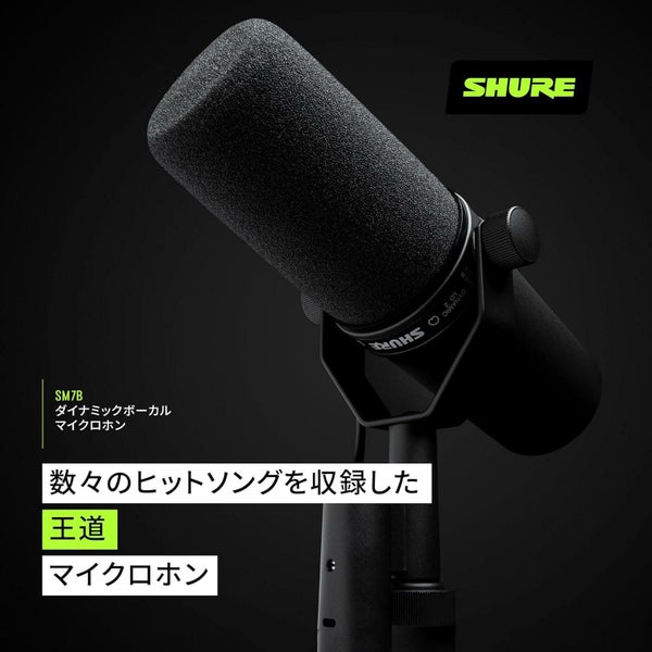 ブロードキャスト、ミュージシャン、スタジオレコーディングなどの用途を問わず、なめらかで温かみのある音質で、ボーカルパフォーマンスを届けるパワフルなダイナミックマイクロホンです。周囲の騒音を排除しながらボーカルの細かなニュアンスを捉え、豊かに伝えます。SM7Bはブロードキャスト・ミュージシャン・音楽業界の必需品です。 SM7Bはプロフェッショナル向けのダイナミックマイクロホンで、ゲインが60dB以上のプリアンプで最適にご利用できます。ご利用の機器のオーディオインターフェイスが十分なゲインを提供できることをご確認ください。プリアンプ内蔵のSM7dBの方が適している場合もあります。