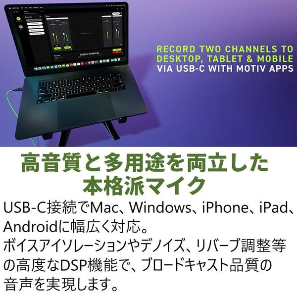 ・高度なDSP機能により、録音または録音後でもプロ仕様オーディオ品質のオーディオが録音可能。MOTIV MixデスクトップアプリとMOTIVモバイルアプリにより簡単に調整可能。
