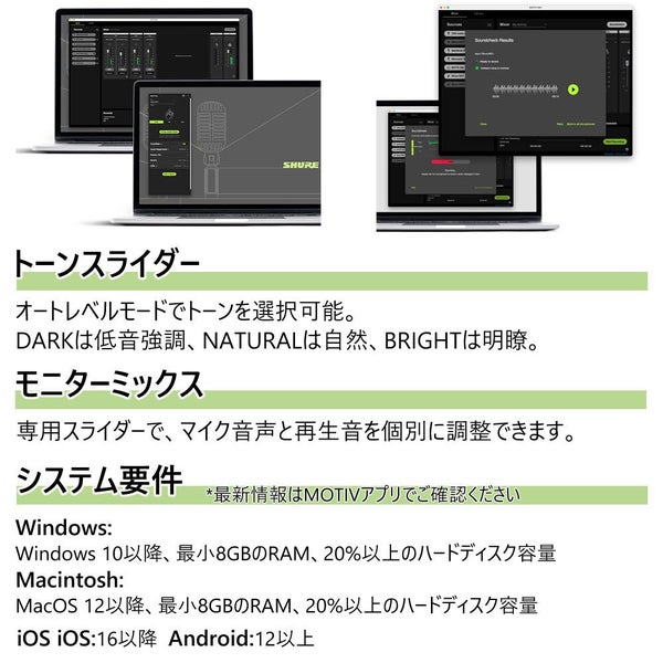 | ソフトウェアの互換性 | MOTIV Mixデスクトップ アプリ、iOSおよびAndroid用MOTIV オーディオアプリ |