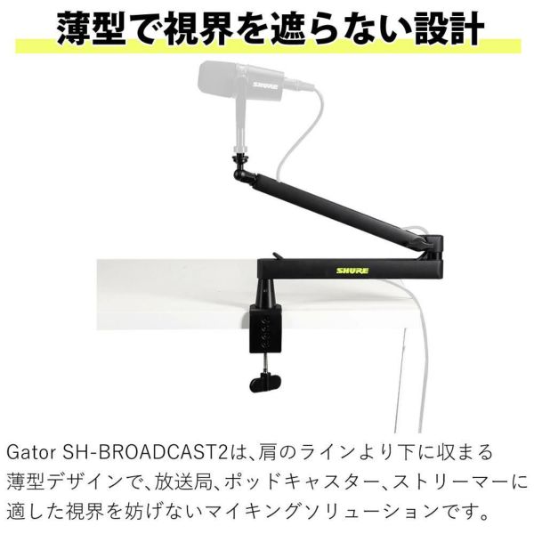 肩のラインより下 に収まる ロープロファイル の Gator SH-BROADCAST2 は、 視界を遮らない デスクマウント の マイクブームアーム 。 スチール製 で 耐荷重 2kg 、 アーム長 838mm 、 水平 360° ・ 垂直 90° の広い可動域を備え、 ブロードキャスト や ポッドキャスト 、 ストリーミング などの 配信環境 に最適。 デスククランプ 55mm 対応 や ダイレクトドリルマウント による設置、 磁気ケーブルチャンネル での ケーブルマネジメント 、 XLR クリアランス を確保する 拡張アダプター で Shure SM7B や MV7 にもスムーズに対応。 静音 回転 で操作感も良好です。