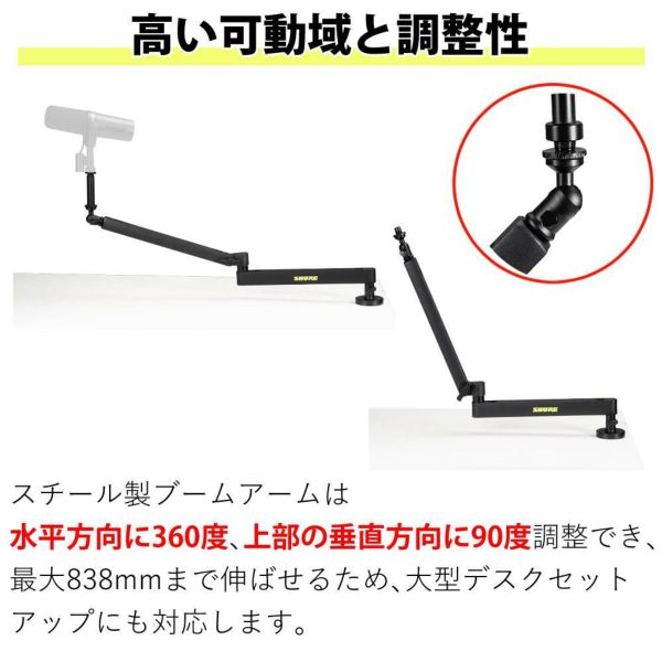 静かに360度回転し、最大833mmのマイクアーム延長が可能。