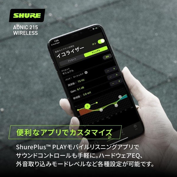 ShurePlus PLAYモバイルリスニングアプリでサウンドコントロールも手軽に。ハードウェアEQ、外音取り込みモードレベルなど各種設定が可能です。音楽ストリーミングサービスなどの外部プラットフォームにもEQ設定が有効になります。