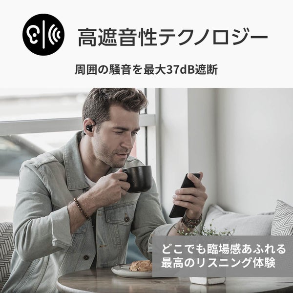 高遮音性テクノロジーが周囲の騒音を最大37dB遮断。イヤホンを装着すれば自分だけのオーディオの世界へ。また、外音取り込みモードを作動させればボタンひとつで周囲の音を確認できます。コンテンツを停止すると自動で外音取り込みがオンになるPausePlus機能も搭載しています。