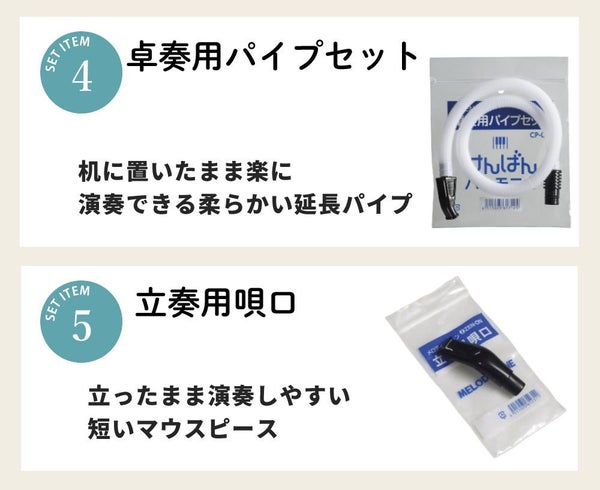 - 卓奏パイプセット(ホース)と立奏用唄口が含まれており、さまざまな演奏スタイルに対応しています。