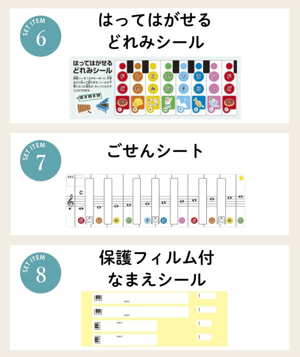 - どれみシールや名前シールなど、楽器のカスタマイズと識別を容易にするアイテムが充実しています。名前シールには保護フィルムが付いており、耐久性があります。