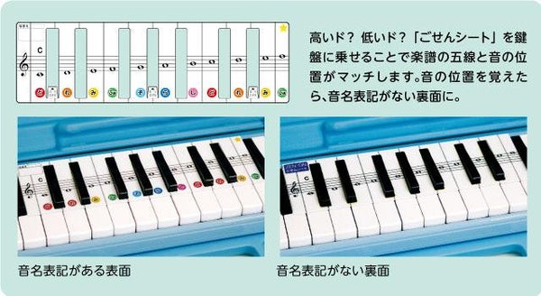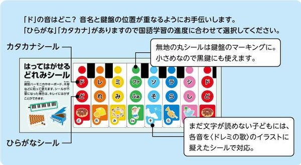 - 付属のどれみシールを使用して鍵盤に貼ることで、視覚的に音符を識別しやすくなり、初心者でも簡単に楽器に親しむことができます。