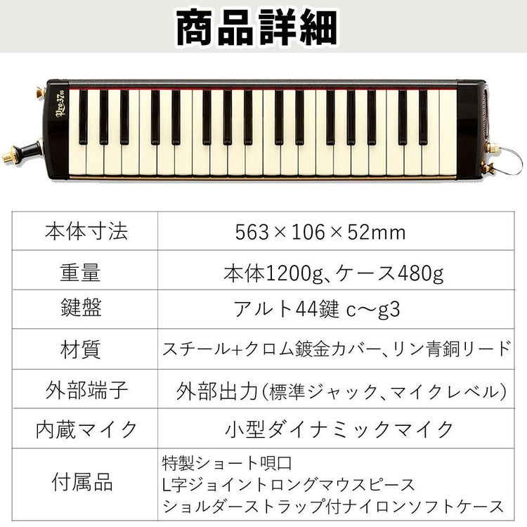 演奏表現の幅が広がる 37鍵 の アルト 鍵盤ハーモニカ 「 スズキ メロディオン PRO?37v3 」は、 リン青銅リード と アルミカバー を採用した 上位モデル です。 木管風 や 金管風 の 豊かな音色 に加え、 音の立ち上がり に優れ、 トレモロ や ビブラート など多彩な 演奏テクニック に対応。 専用 ソフトケース付き で持ち運びも安心。 国内生産 による信頼性と 高級感 を兼ね備えた SUZUKI の 鍵盤楽器 です。