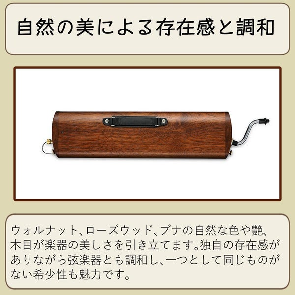 ウォルナット、ローズウッド、ブナ、それぞれが自然に持つ色や艶、模様がそのままこの楽器の美しさになっています。