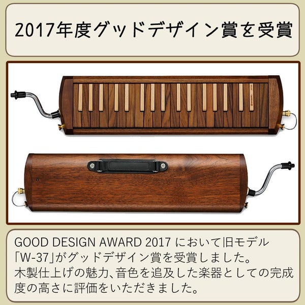 SUZUKI の 木製鍵盤ハーモニカ W-37C は、ウォルナットカバー と ローズウッド鍵盤 を採用した ハンドメイド の メロディオン。柔らかな音色 が特徴で、クラシック や ジャズ、ミュゼット に最適。ストラップピン付き で 演奏性 も高く、特製唄口 と ソフトケース が付属しています。