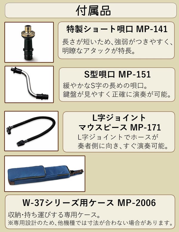 | 付属品 | 特製ショート唄口(MP-141)、S型唄口(MP-151)、L字ジョイントロングマウスピース(MP-171)、ソフトケース(MP-2006) |