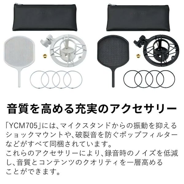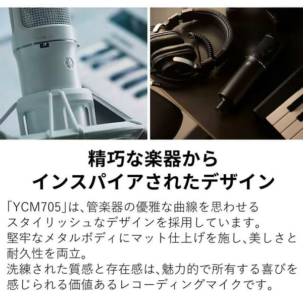 ヤマハ の コンデンサーマイクロフォン YCM705 は 高感度 単一指向性 で ノイズ低減 を実現し、ポッドキャスト や ゲーム実況 に最適です。USBマイク として テレワーク や ナレーション 動画収録 ライブ配信 にも対応する 高音質 オーディオ機器 です。