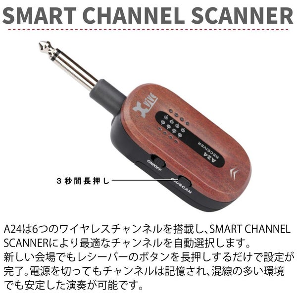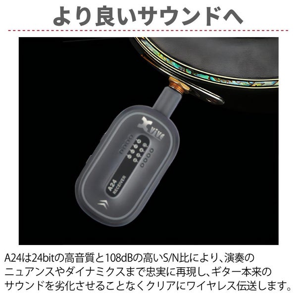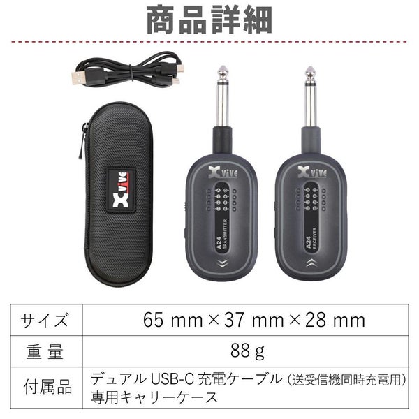 この Xvive XV-A24 ワイヤレスギターシステム は グレー カラー で ギター用ワイヤレス システム として 優れた パフォーマンス を 実現 します。2.4GHz の 高音質 ワイヤレス 伝送 は 最大 約30m の 伝送距離 を 実現 し、ステージ 上 で 自由 に 移動 しながら 演奏 が 可能 です。24bit の 高解像度 オーディオ と 108dB の 高い S/N比 により、ケーブル 接続 に 近い クリア サウンド を 再現 し、 アクティブ・パッシブ 対応 で 幅広い ギター・ベース に 対応 します。6 チャンネル 選択 と SMART CHANNEL SCANNER で 混雑 した 環境 でも 安定 した 通信 を 保持 し、 USB?C 充電 対応 の 専用キャリーケース 付属 で 持ち運び も 快適 です。