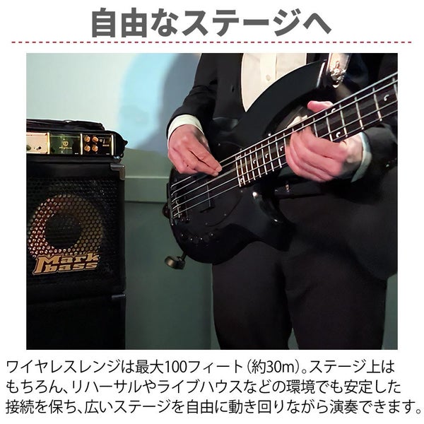 ワイヤレスレンジは100フィート(約30m)。ステージを広々と使って自由に動き回ることができます。