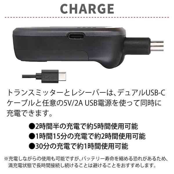 トランスミッターとレシーバーは、デュアルUSB-Cケーブルと任意の5V/2A USB電源を使って同時に充電できます。