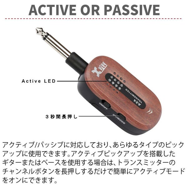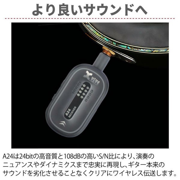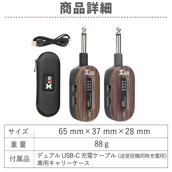 この Xvive XV-A24 ワイヤレスギターシステム は ローズウッド カラー で ギター用ワイヤレス システム として 優れた パフォーマンス を 実現 します。2.4GHz の 高音質 ワイヤレス 伝送 は 最大 約30m の 伝送距離 を 実現 し、ステージ 上 で 自由 に 移動 しながら 演奏 が 可能 です。24bit の 高解像度 オーディオ と 108dB の 高い S/N比 により、ケーブル 接続 に 近い クリア サウンド を 再現 し、 アクティブ・パッシブ 対応 で 幅広い ギター・ベース に 対応 します。6 チャンネル 選択 と SMART CHANNEL SCANNER で 混雑 した 環境 でも 安定 した 通信 を 保持 し、 USB?C 充電 対応 の 専用キャリーケース 付属 で 持ち運び も 快適 です。