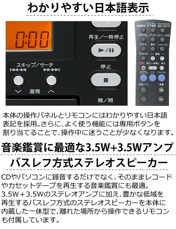 3.5W+3.5Wのステレオアンプに加え、豊かな低域を再生するバスレフ方式のステレオスピーカーを本体に内蔵した一体型で、離れた場所から操作できるリモコンも付属しています。